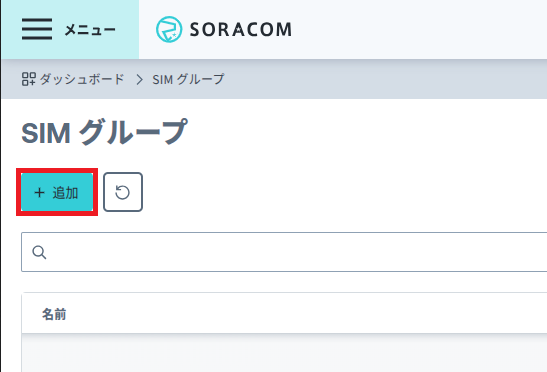 [メニュー] – [SIMグループ] で SIM グループ管理画面を表示し、 [+ 追加] ボタンをクリックします。