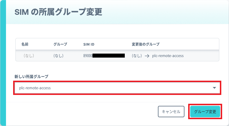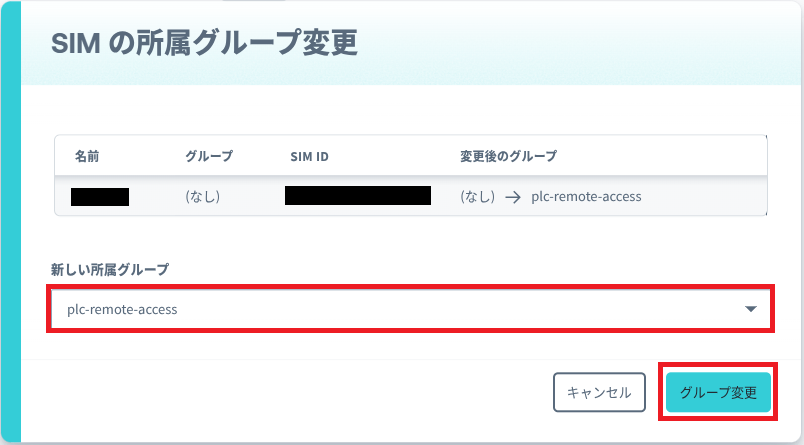 さきほど作成したバーチャル SIM と同じ SIM ID の SIM にチェックを入れ、[操作] – [所属グループを変更] を選択して新しい所属グループ 「plc-remote-access」を設定します。