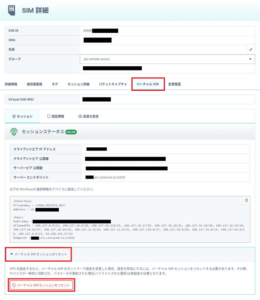 SIM 詳細画面から [バーチャル SIM] タブを選択し、[バーチャル SIM セッションのリセット]をクリック、表示される赤いボタンの [バーチャル SIM セッションをリセット] をクリックします。