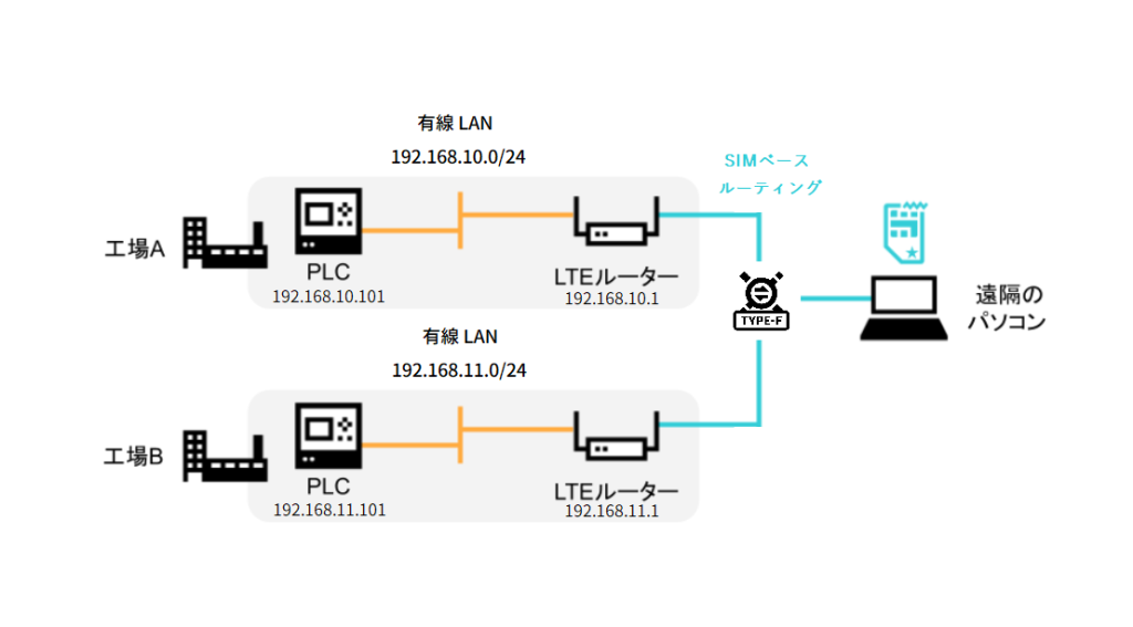 VPG Type-F の SIM ベースルーティングでは、遠隔地のパソコンから直接LTEルーター配下のPLCのIPアドレスを指定することができます。