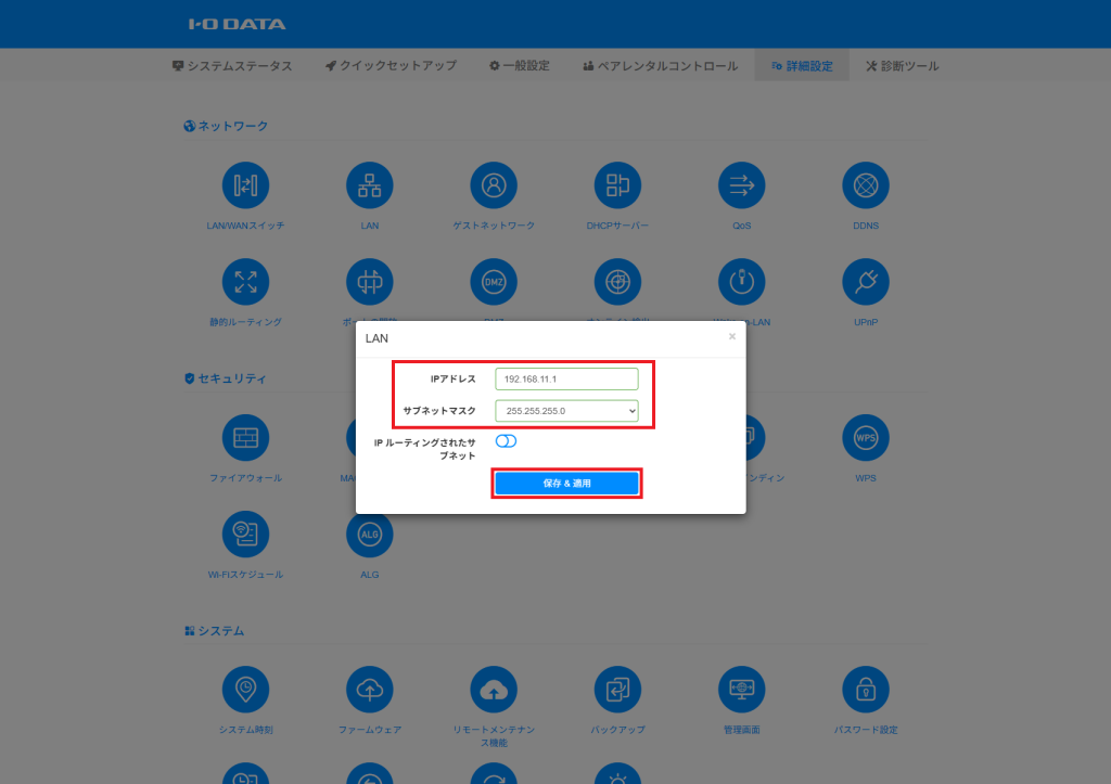 LTE ルーターの LAN側 のIP アドレスは、UD-LTA のセットアップ後にルーター設定画面の [詳細設定] – [LAN] から変更が可能です。