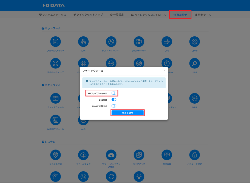 [SPIファイアウォール] をオフにして [保存 & 適用] をクリックします。