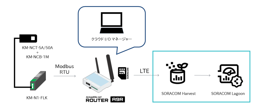産業用途向けの省電力IoTルーター「Armadillo-IoTルーター A9R」と、Modbus RTUに対応した小型電力量モニタ「KM-N1-FLK」を組み合わせ、遠隔地の電力使用状況をリアルタイムでモニタリングする仕組みを作ります。