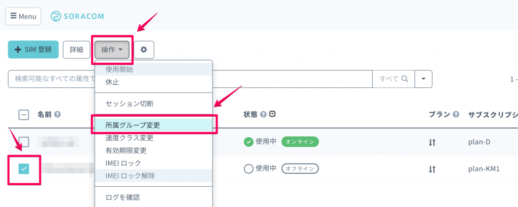 SORACOM LTE-M Button の SIM だけにチェックを入れた状態で「操作」をクリックし、「所属グループ変更」をクリックします。