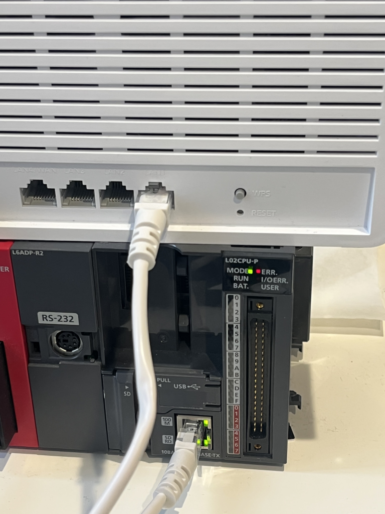 今回はPLC の Ethernet ポートが未使用の場合と仮定し、 LAN ケーブルで LTE ルーターと直接接続します。重複しない任意のプライベート IP アドレスを決めます。この情報は後で利用するため、メモをしておいてください。