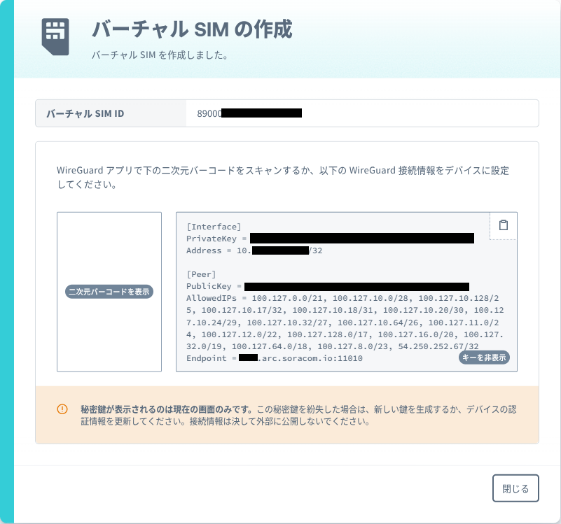 また、このあとの手順でバーチャル SIM を SIM グループに紐付けるので、表示されている [バーチャルSIM ID] の値を控えてから [閉じる] ボタンでダイアログを閉じます。