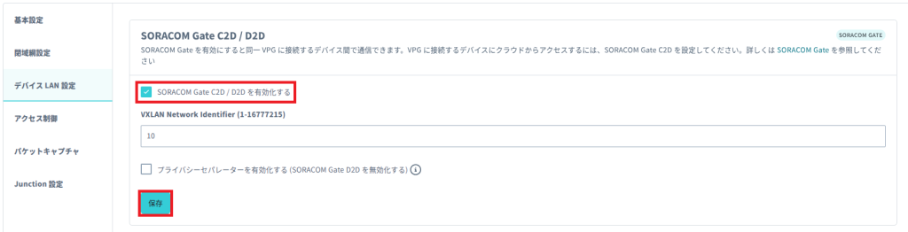 作成した VPG を選択し、プロパティ画面の [デバイス LAN 設定] タブを表示します。 [SORACOM Gate C2D / D2D を有効化する] にチェックを入れて、 [保存] ボタンをクリックします。